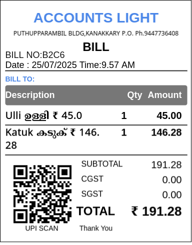 നിങ്ങളുടെ ബിസിനസ്സിന്റെ സാമ്പത്തിക കാര്യങ്ങൾ കൂടുതൽ കാര്യക്ഷമമാക്കാൻ ACCOUNTS LIGHT നിങ്ങളെ സഹായിക്കും. കൂടുതൽ വിവരങ്ങൾക്കും ഡെമോയ്ക്കും ഞങ്ങളെ ബന്ധപ്പെടുക.
